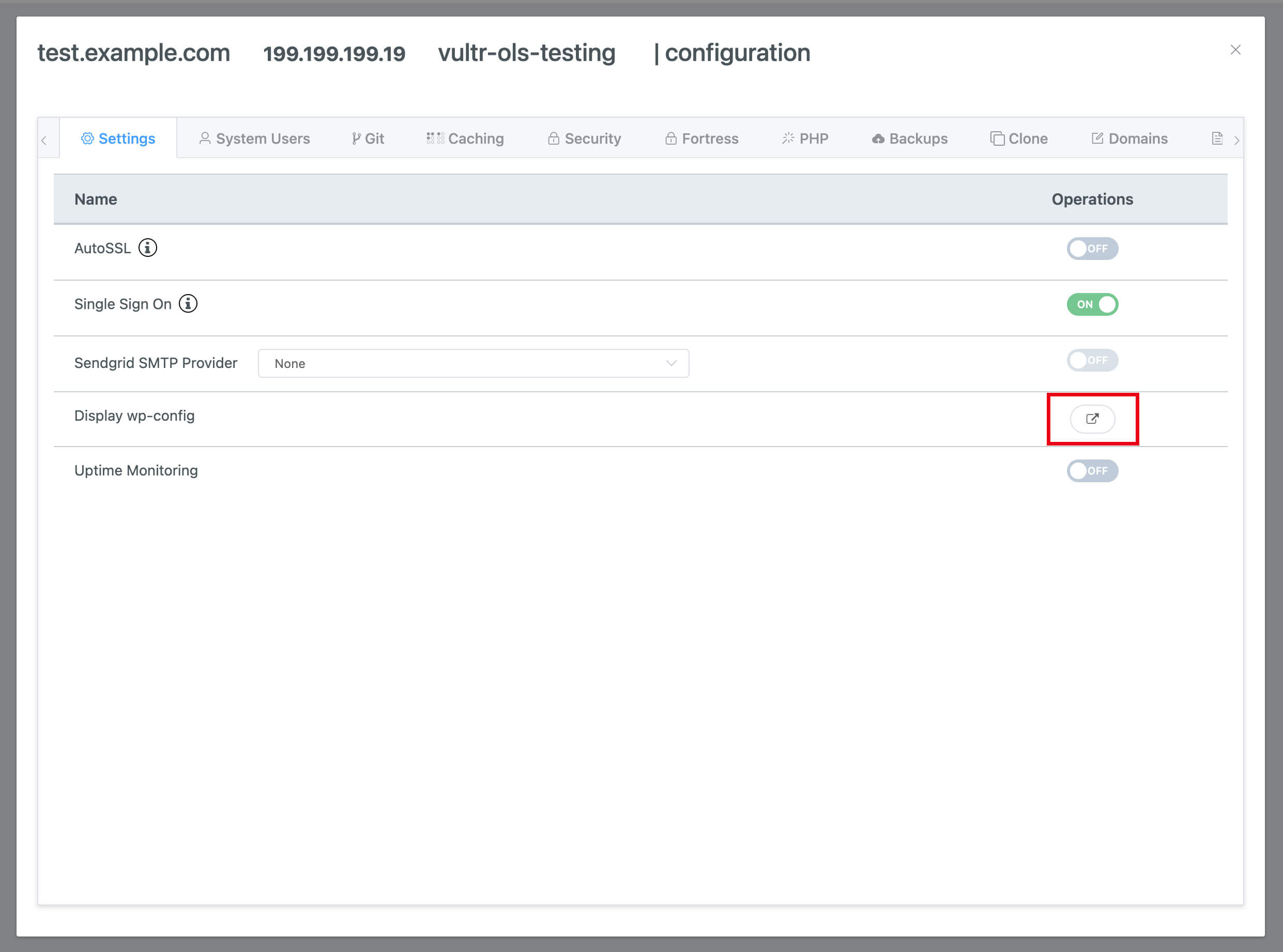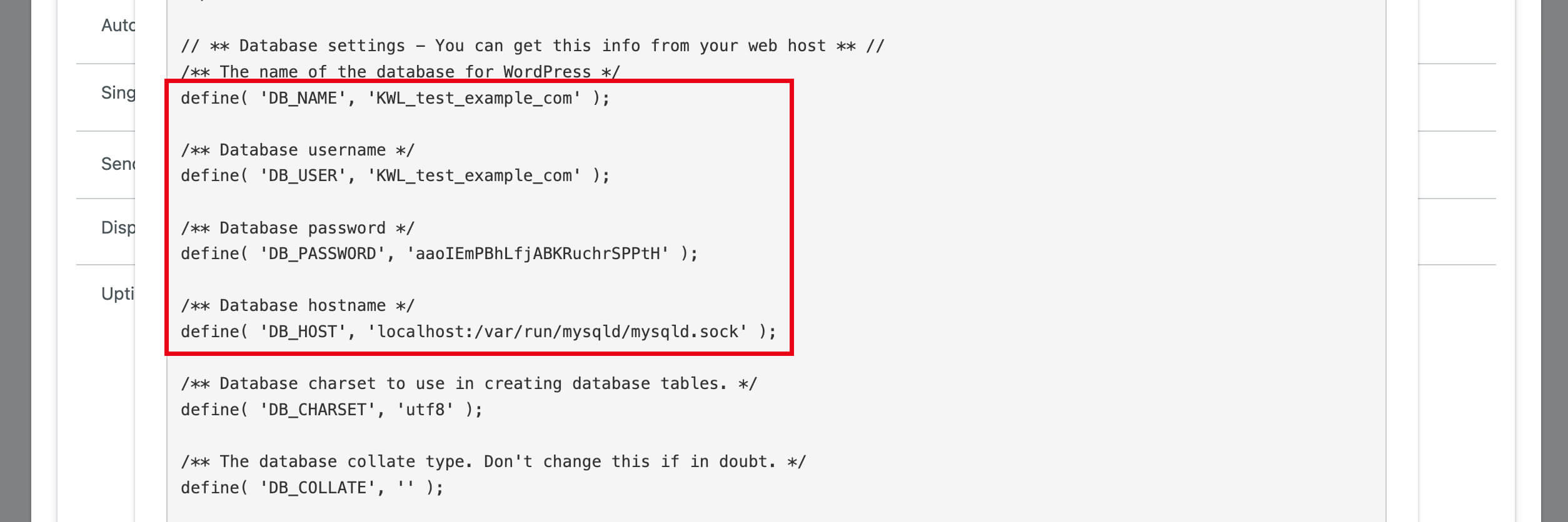 GridPane will retrieve your wp-config.php file and display its contents in a pop-up modal window. You will need to make note of your WordPress MySQL database settings as outlined below: