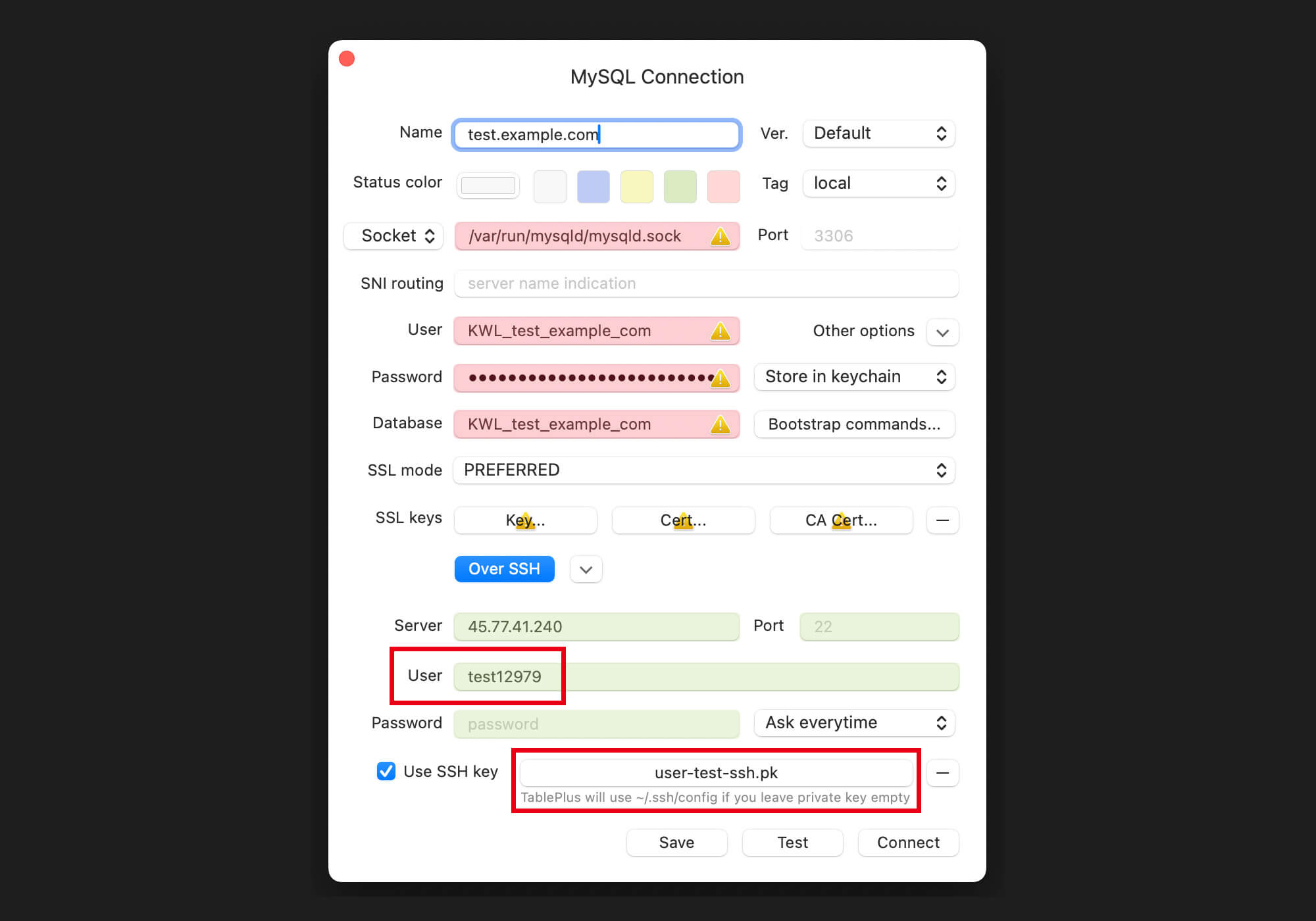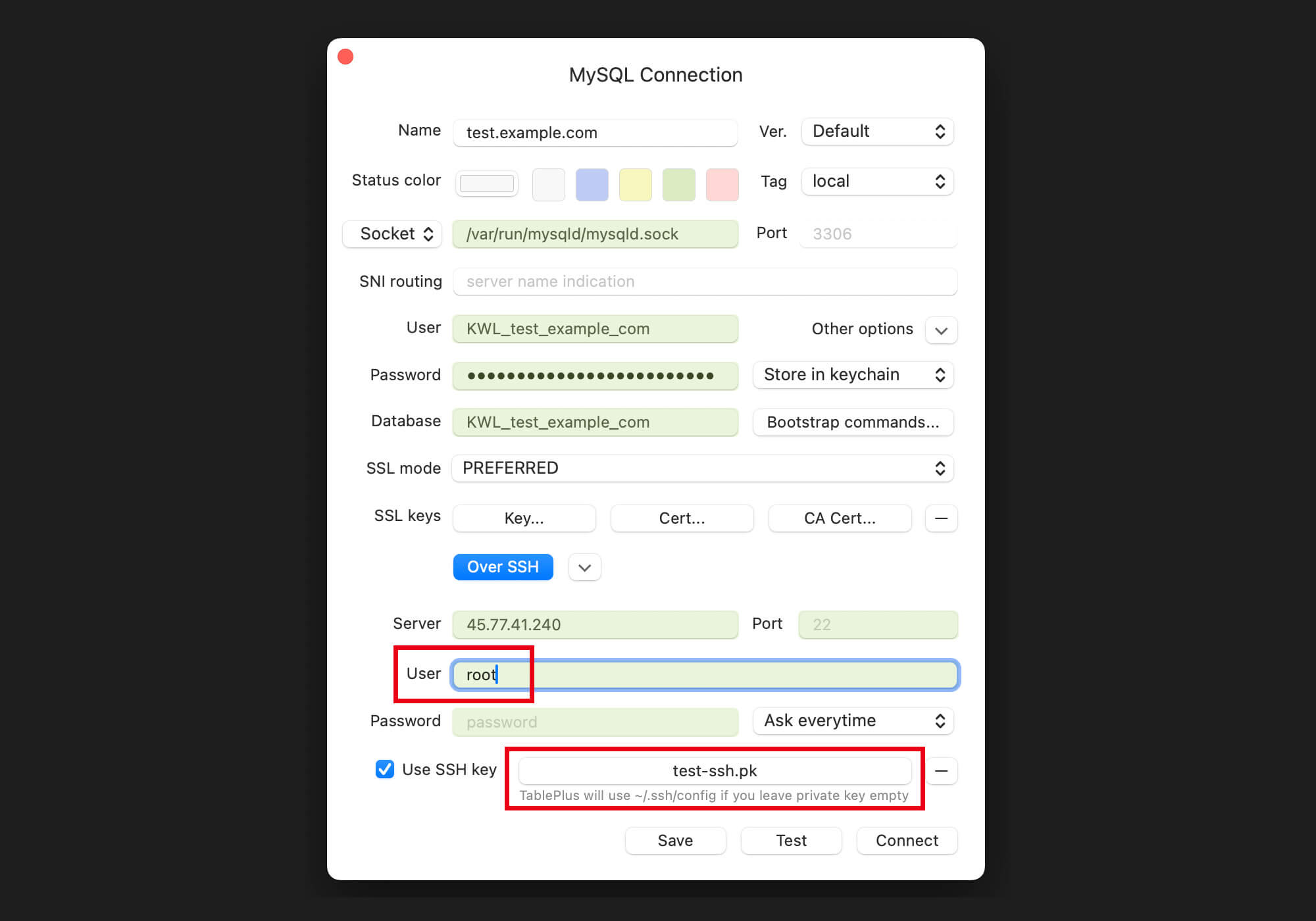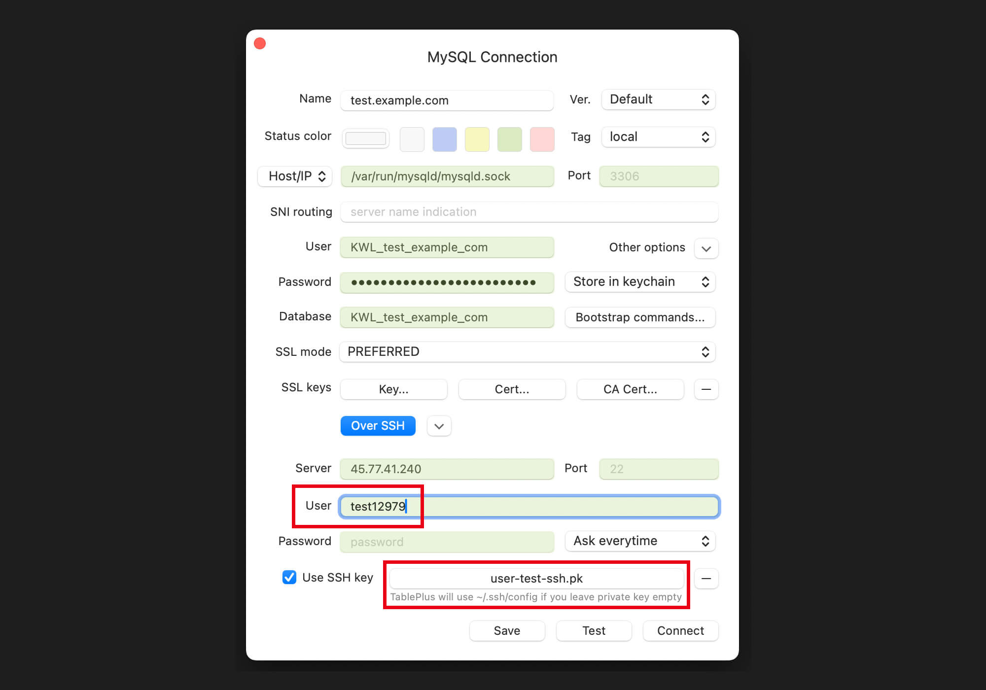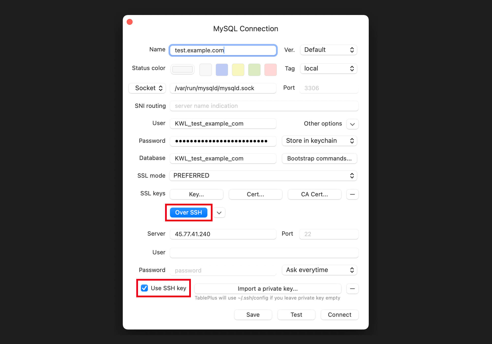 Open up your chosen database client and ensure you select SSH as the connection method – in TablePlus this is displayed as a blue button that states “Over SSH”. You may see a similar setting in other clients, or you may see a dropdown selection.