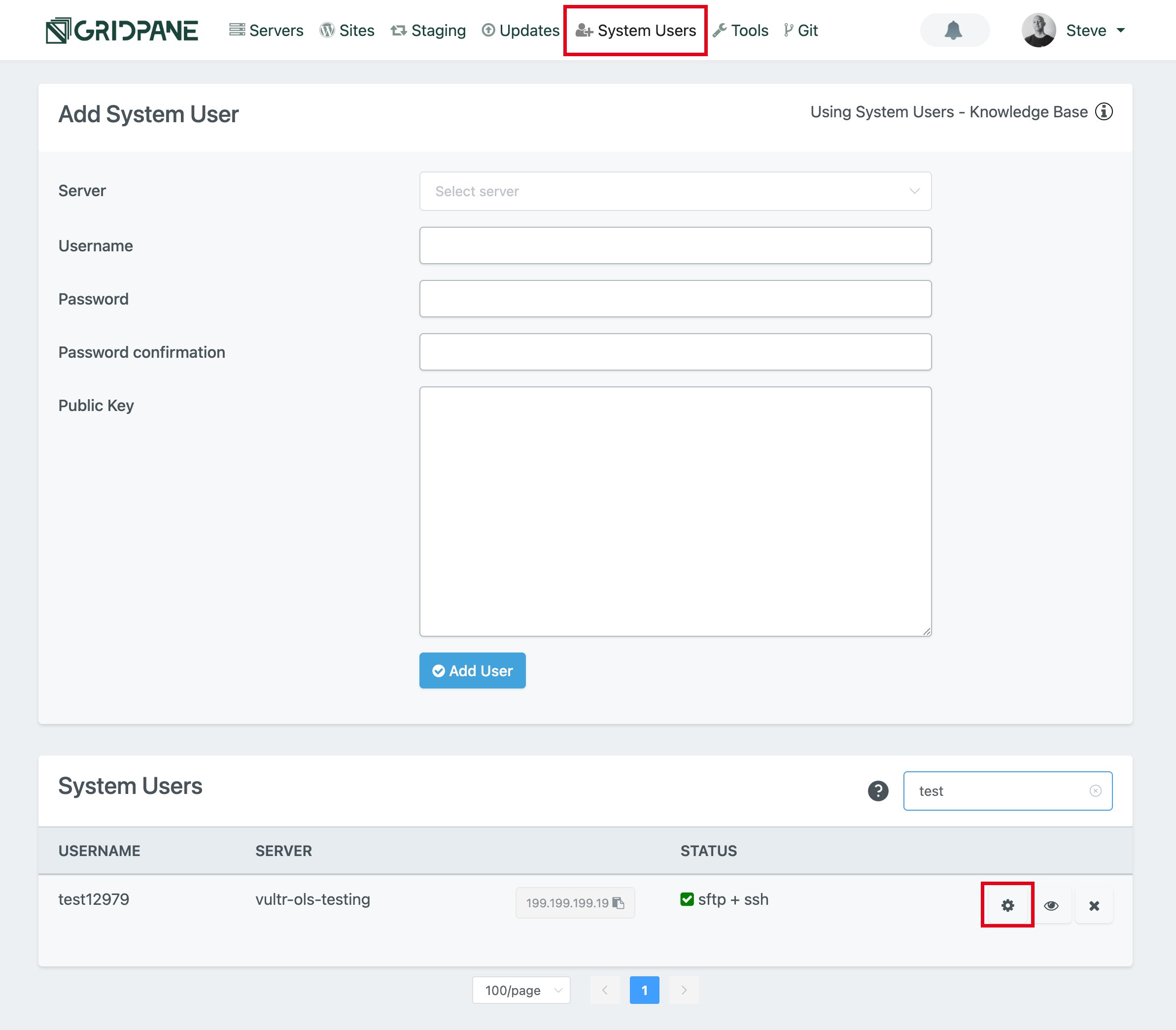 You can add a public SSH key to a system user by heading to the system users page, locating the website’s system user, and clicking the cog button: