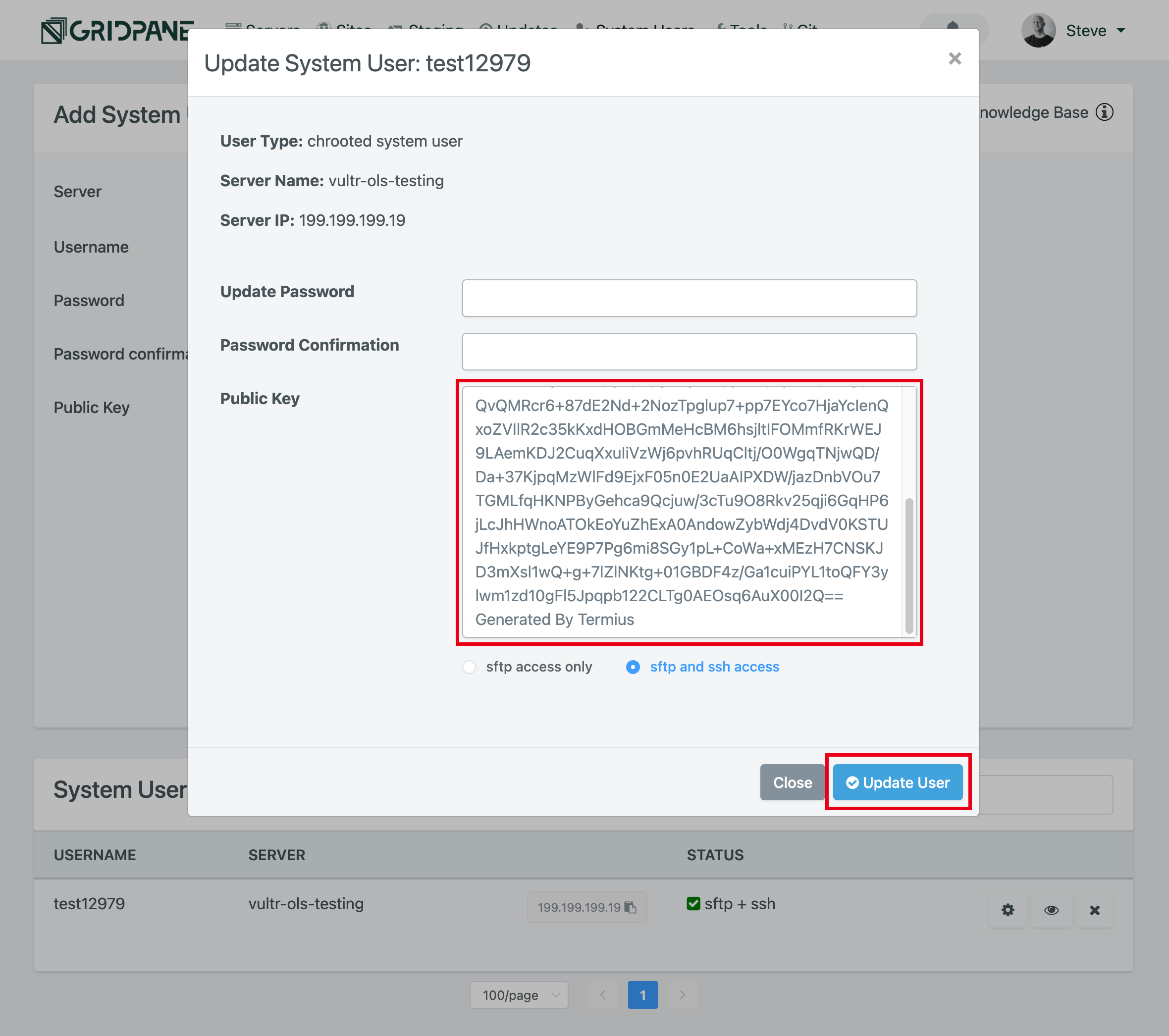 Here you can paste your public SSH Key, and make sure that SFTP and SSH access are enabled. Next, hit the Update User button to push it to the server.